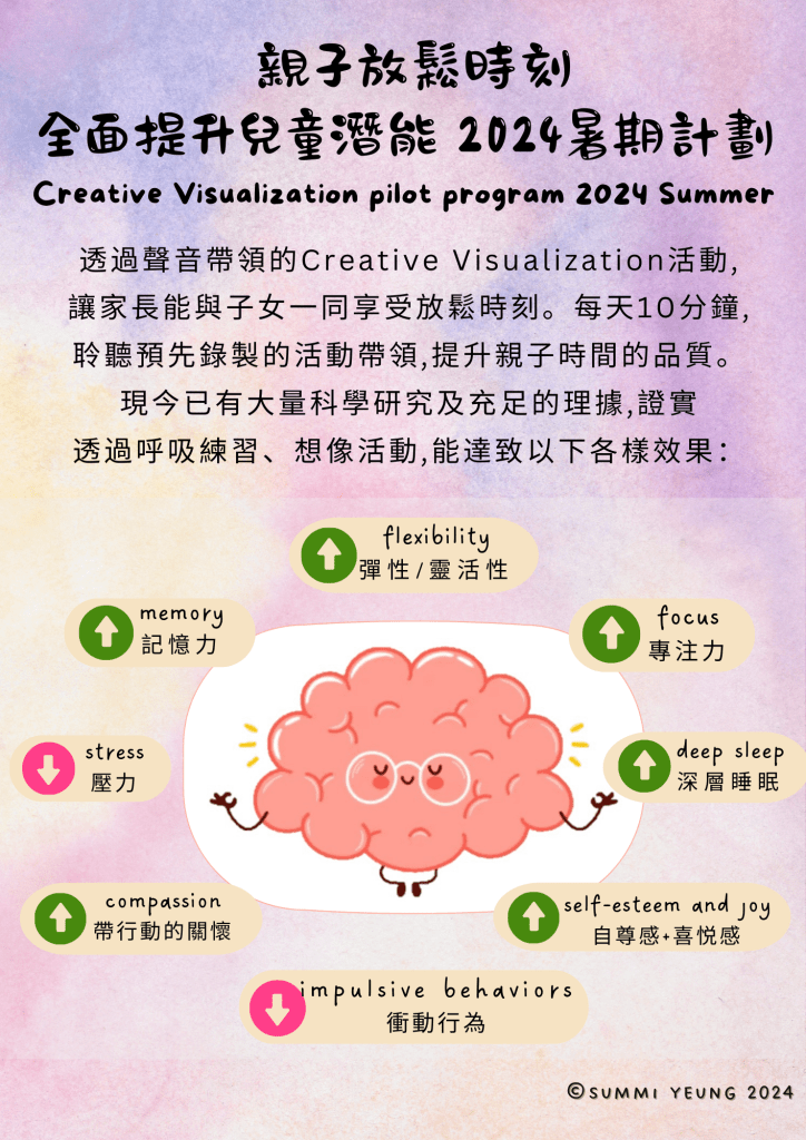 透過聲音帶領的Creative Visualization活動,讓家長能與子女一同享受放鬆時刻。每天10分鐘聆聽由Ms Summi 預先錄製的活動帶領,提升親子時間的品質。